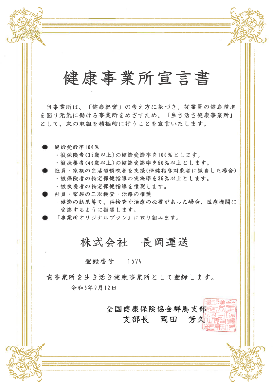 株式会社 長岡運送は、「健康経営」の考え方に基づき、従業員の健康増進を図り元気に働ける事業所をめざすため、「生き活き健康事業所」として、次の取組を積極的に行うことを宣言いたします。